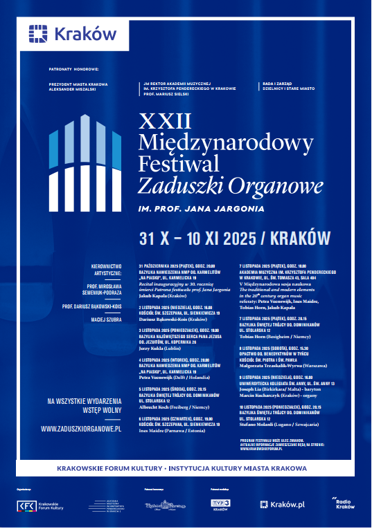 Serdecznie zapraszam na koncert inaugurujący tegoroczny XXII Międzynarodowy Festiwal Zaduszki Organowe im. prof. Jana Jargonia w Bazylice OO. Karmelitów na Piasku 31.10.2025 o godz. 20:00.